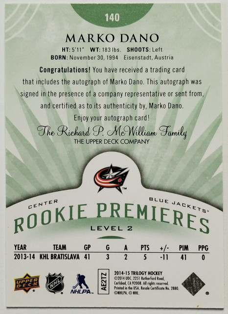 2014-15 Upper Deck Trilogy Rookie Premieres Level 2 Radiant Green #140 Marko Daňo RC SN 76/99