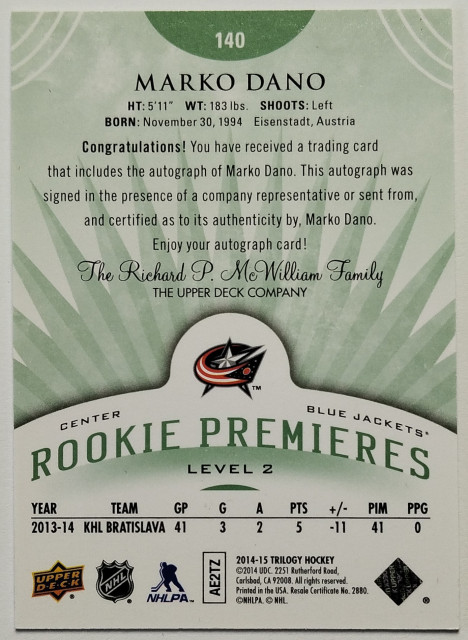 2014-15 Upper Deck Trilogy Rookie Premieres Level 2 Radiant Green #140 Marko Daňo RC SN 86/99
