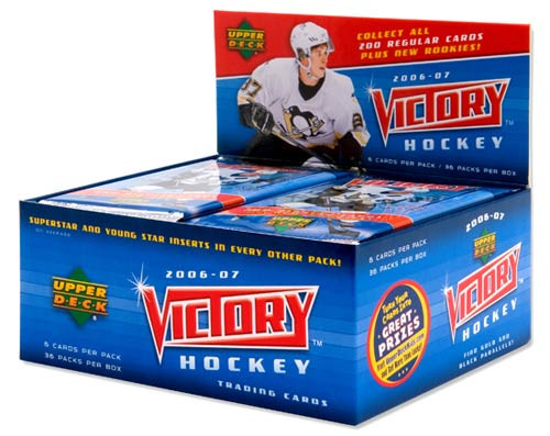 Zberateľské hokejové karty Upper Deck Victory 2006-07. V balíčku sa nachádza 6 kariet. Set obsahuje 200 základných kariet a inzertné karty vkladané do balíčkov v pomere uvedenom v zátvorke: Victory Rookies (1:2), Gamebreakers (1:4), Next In Line (1:4). Paralelné karty: Gold Regular (1:36), Gold Rookie (1:240), Black Regular (1:720), Black Rookie (1:4,800).